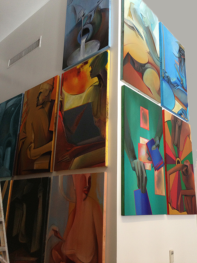 The "All the Faces of the Moon" series comprises the 22 major arcana of the Tarot, the 5 planets, and opening and closing night "Dealer" paintings. Each is 30 by 48 inches, oil on canvas.